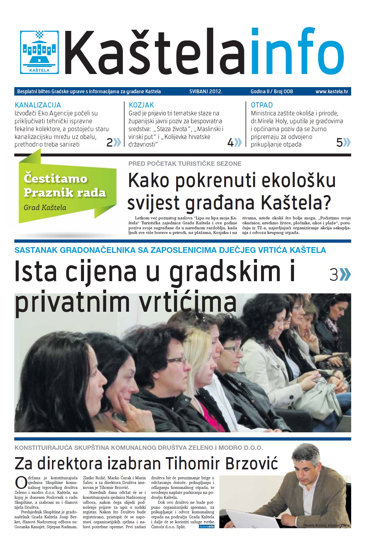 Novi broj biltena donosi niz informacija i tema od kojih izdvajamo: Eko počeo priključivati tehnički ispravne kolektore, Ista cijena u gradskim i privatnim vrtićima, Cemexova studija utjecaja na okoliš, financiranje sportskih klubova, najava početka Dana Kaštelanskog kazališta i sl.