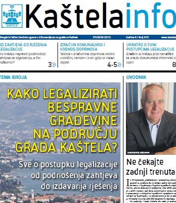 30. November 2012.29. August 2024. Sve o legalizaciji u novom Kaštelainfo City of Kaštela > Novosti > Sve o legalizaciji u novom Kaštelainfo Novi broj biltena Kaštelainfo u cijelosti je posvećen legalizaciji bespravno izgrađenih objekata. Već danas je dostupan na ovim stranicama, a od ponedjeljka, 3. prosinca i u tiskanom izdanju. Kaštelainfo 10 Share Back