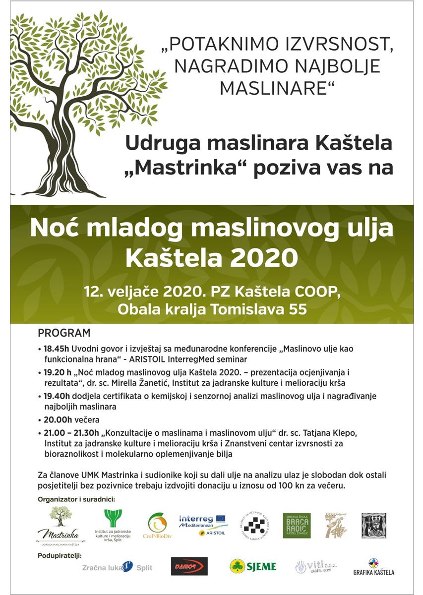 Manifestacija „Noć mladog maslinovog ulja – Kaštela 2020.“ održat će se 12. veljače 2020. u prostorima Poljoprivredne zadruge Kaštela COOP u Kaštel Starom s početkom u 18:45 sati. Organizator je Udruga maslinara Kaštela „Mastrinka“ u suradnji s Institutom za jadranske kulture i melioraciju krša, Znanstvenim centrom izvrsnosti za bioraznolikost i molekularno oplemenjivanje bilja (CoE Crop-BioDiv), ARISTOIL Interreg Med projektom, Društvom Bijaći, SŠ Braća Radić, OŠ Bijaći i PŠ Ljubitovica.
