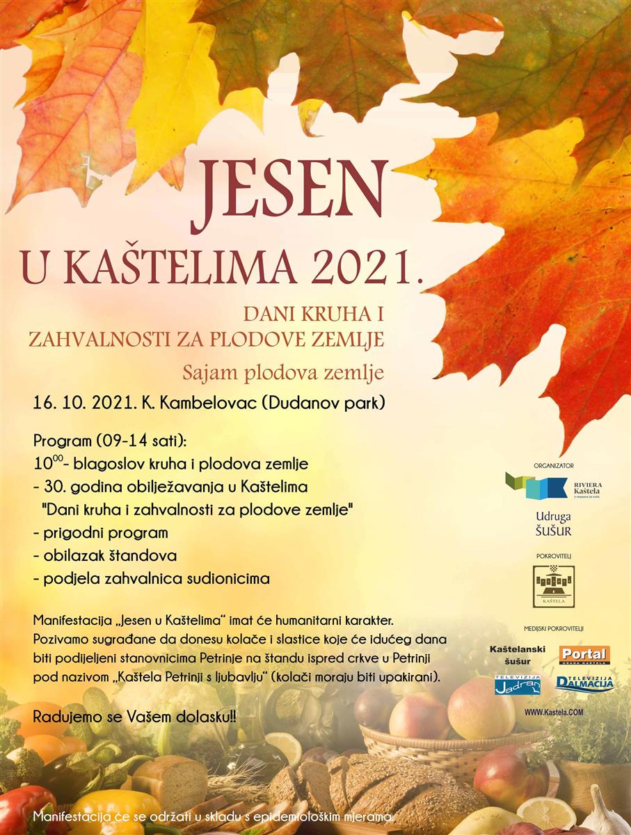 Program će se održati u subotu, 16. listopada 2021. U Dudanovom parku u Kaštel Kambelovcu od 9 do 14 sati. Svečano otvaranje manifestacije je u 10 sati uz kulturni – gastro program, blagoslov kruha i plodova zemlje, nastup KUD-ova, klapa i djece, obilazak štandova te podjelu zahvalnica sudionicima.