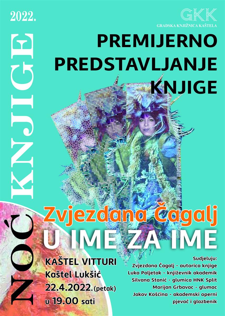 Premijerno predstavljanje knjige poezije Zvjezdane Čagalj U IME ZA IME održat će se u sklopu Noći knjige u petak 22. travnja u 19.00 sati u dvorcu Vitturi u Kaštel Lukšiću u organizaciji Gradske knjižnice Kaštela.
