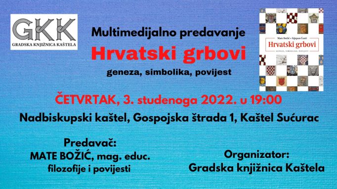U sklopu Mjeseca hrvatske knjige Gradska knjižnica Kaštela u četvrtak 3. studenoga u 19 sati u Nadbiskupskoj palači u Kaštel Sućurcu organizira multimedijalno predavanje „Hrvatski grbovi – geneza, simbolika, povijest“ o nastanku, oblikovanju i uporabi hrvatskih zemaljskih grbova od sredine 13. do kraja 17. stoljeća. Predavanje će održati mag. educ. filozofije i povijesti Mate Božić, član Udruge „Toma Arhiđakon“ te član Hrvatskog grboslovnog i zastavoslovnog društva.