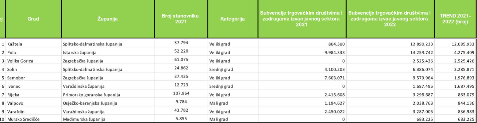 U odnosu na godinu ranije daleko najviše su sredstva za subvencije nominalno povećala Kaštela, za rekordnih 12.085.933 kune, potom Pula – 4.275.409 kuna, Velika Gorica – 2.525.426 kuna, Solin – 2.285.871 kunu, Samobor- 1.976.893 kune, Ivanec – 1.687.495 kuna, a Top 10 zatvaraju Rijeka, Valpovo, Varaždin i Mursko Središće, s povećanjem od 683.225 do 883.079 kuna. Porast iznad 10 milijuna upisalo je 1 grad, iznad 1 milijun – 6 gradova, od 200.000 do 1.000.000 – 15 gradova, između 100 i 200 tisuća kuna- 9, od 10.000 do 100.000 kuna povećanje izdvajanja bilježi– 10 gradova.