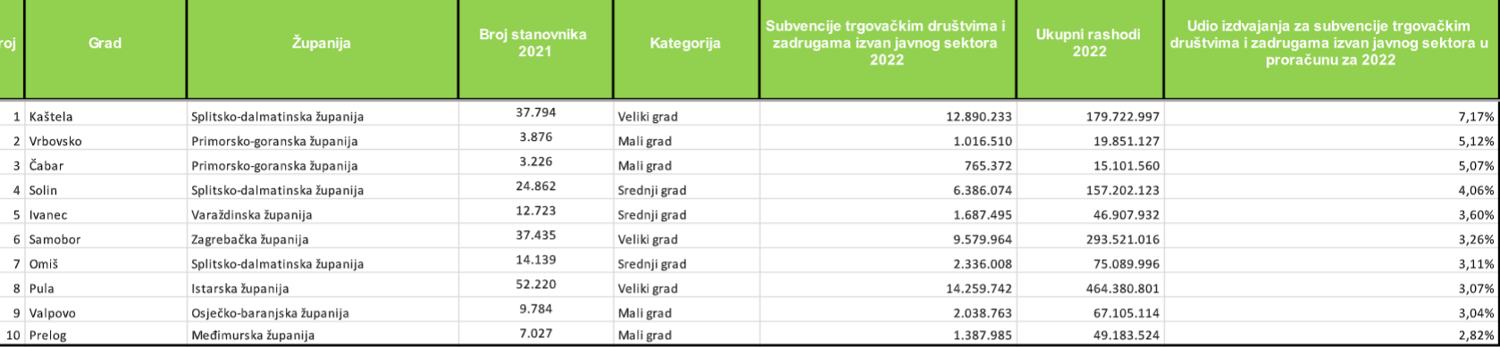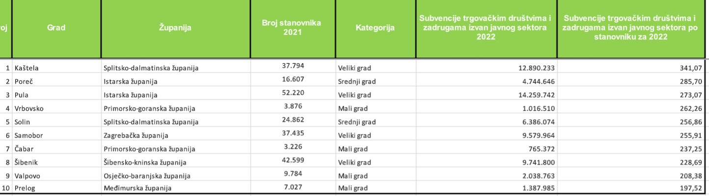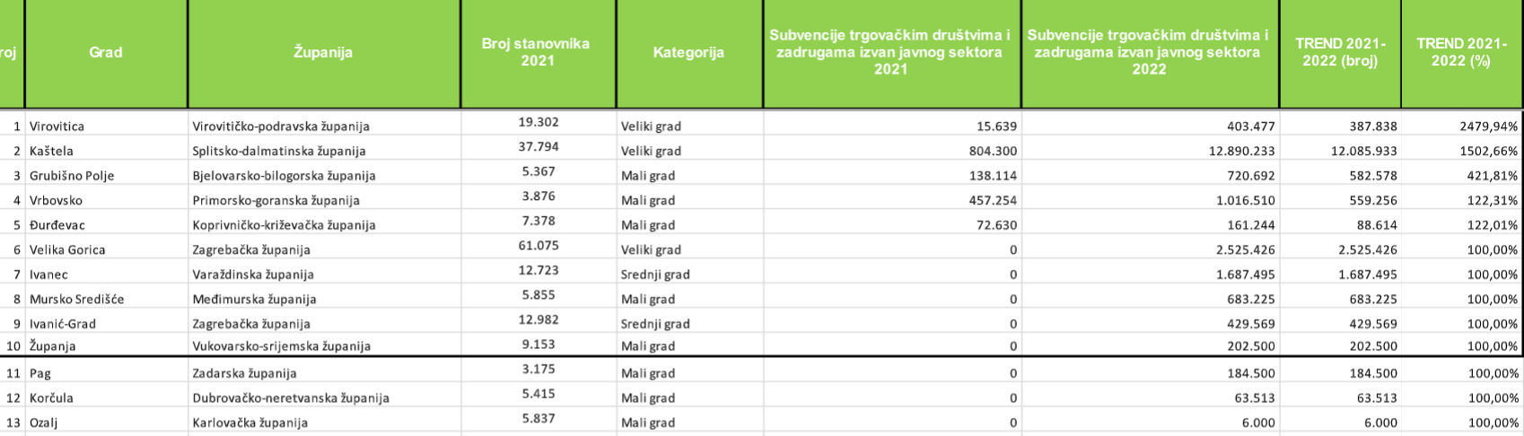 Iz podataka je uzeta stavka subvencije trgovačkim društvima i zadrugama izvan javnog sektora. Riječ je o privatnim tvrtkama kojima su hrvatski gradovi novčano pomogli različitim potporama, ali treba ipak i ovog puta napomenuti vjerojatnost da kod pojedinih gradova nije bilo odvojeno knjiženih potpora namijenjenih poduzetnicima i obrtnicima.