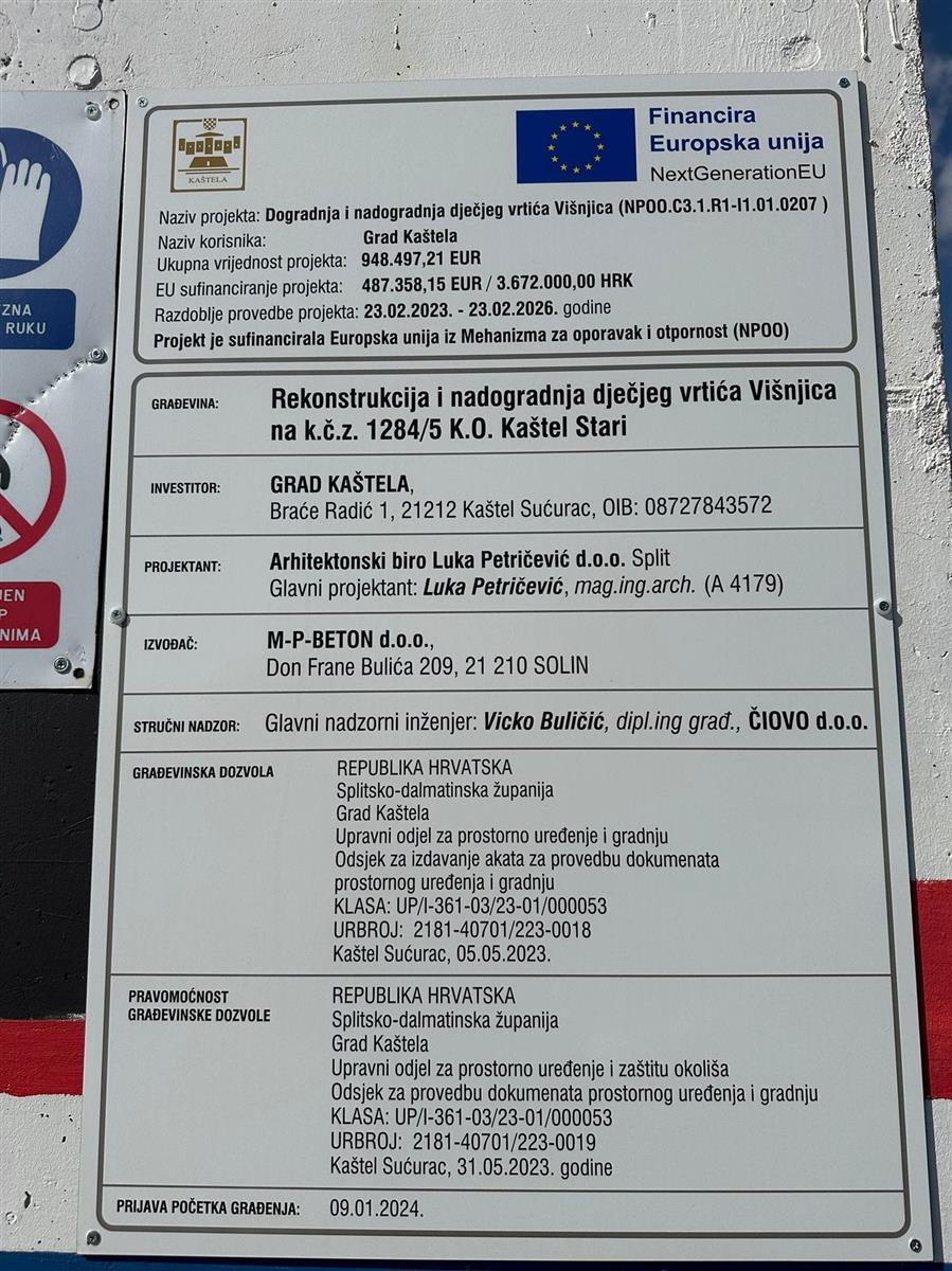 Za investiciju dogradnje i nadogradnje (rekonstrukcije) dječjeg vrtića Višnjica, Grad Kaštela je krajem veljače 2023. godine potpisao Ugovor o dodjeli bespovratnih sredstava za projekte koji se financiraju iz Mehanizma za oporavak i otpornost vrijedan 487.358,15 €.