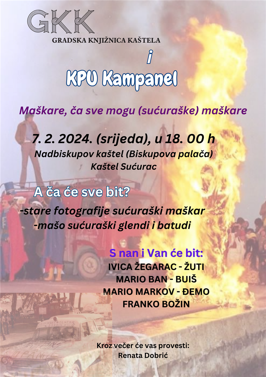 Gradska knjižnica Kaštela i KPU „Kampanel“ u srijedu 7. veljače u 18.00 sati u Nadbiskupovom kaštelu u Kaštel Sućurcu organiziraju humorističnu večer „Maškare, ča sve mogu sućuraške maškare“ ususret ovogodišnjem "Sućuraškom krnjevalu koji će ove, 2024. godine, krenit s pokojne pilane u 15 uri u subotu 10. vejače".