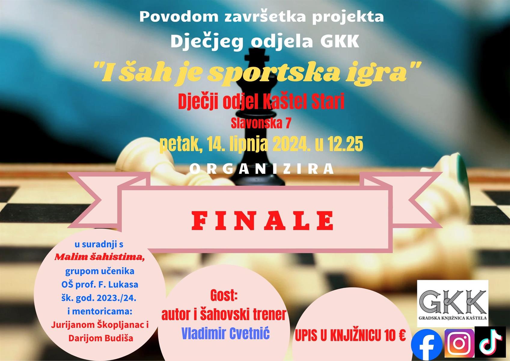 Veliko finale projekta Dječjeg odjela Gradske knjižnice Kaštela u Kaštel Starome I šah je sportska/društvena igra održati će se u petak 14. lipnja 2024. u 12.25 sati u Dječjem odjelu GKK u Kaštel Starome na adresi Slavonska 7, u sklopu Gradske dvorane i u blizini OŠ prof. Filipa Lukasa. Na događanju, u sklopu kojeg će ujedno biti organiziran i „dan otvorenih vrata“ kao poseban gost sudjelovat će autor knjige Šah i kako ga lako naučiti igrati, šahovski trener Vladimir Cvetnić. Nakon odigranog finala, pobjednicima će biti uručene medalje, a svima ostalima zahvalnice za sudjelovanje.